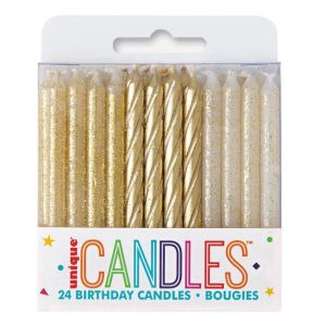 “Gold & Gold Glitter Spiral Candles 24pk” has been added to your cart.