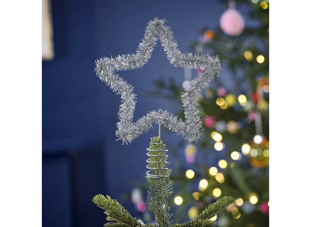 Merry & Bright Silver Tinsel Christmas Tree Star Topper